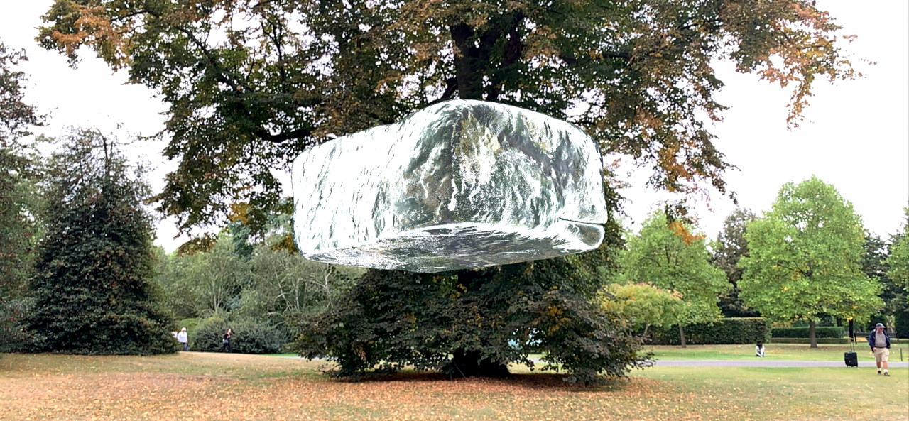 Koo Jeong A’s augmented reality artwork Density (2019) invites us to participate in such an actualization process. The piece, a virtual reality icecube that hovers in the air in a hidden garden of Regent’s Park, London, can only be seen with the right device, and reflects its surroundings in a fully responsive manner. “The virtual does not make place and physical location irrelevant, but rather asks of us to conceive of it differently, not as a given, something already there, but as the result of operations that produce a localization, which does not make it any less real” writes philosopher Sven-Olov Wallenstein in his commentary of Koo Jeong A’s piece.